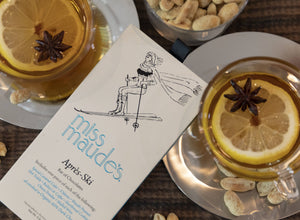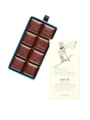 Snow Bunnies! Do you only ski to Apres? Whether you fancy hot spiced cider and s’mores by the fire, a hot toddy with wasabi nuts at the bar, mulled wine with cheese fondue in the chalet, or warm Bailey’s & Coffee with buttery cookies while watching people slide down the last run, Miss Maude has combined your favorite Après ski treats into one deliciously decadent chocolate bar. 8 flavor chocolate bar: spiced caramel cider, s'mores, wasabi peanuts, mulled wine, bailey's & coffee, shortbread cookies, cheese fondue, and hot toddy, all enrobed in organic 60% dark chocolate. Net weight 4.3 ounces (122g).