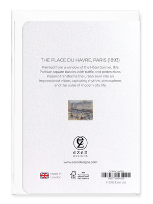 Text on the reverse side: Painted from a window of the Hôtel Garnier, this Parisian square bustles with traffic and pedestrians. Pissarro transforms the urban swirl into an Impressionist vision, capturing rhythm, atmosphere, and the pulse of modern city life.