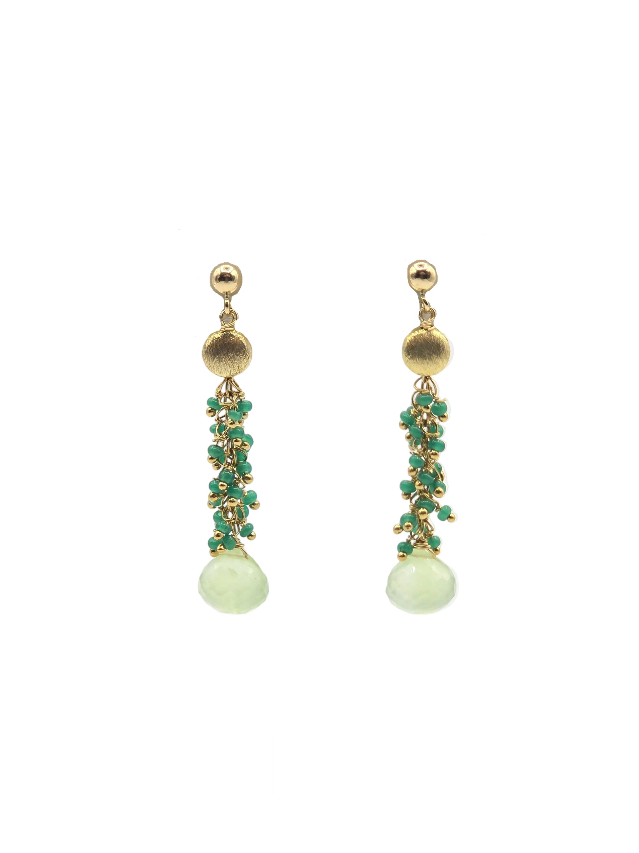A combination of brushed gold plated coins beads and colorful glass beads clusters with faceted teardrop on gold-filled posts.