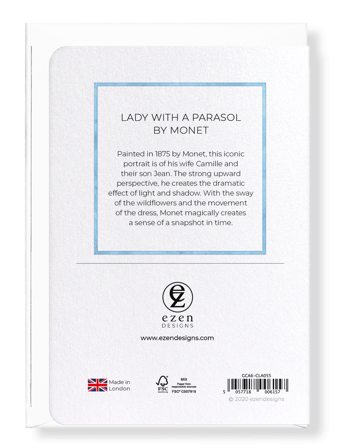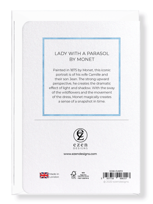 Text on the reverse side: Painted in 1875 by Monet, this iconic portrait is of his wife Camille and their son Jean. The strong upward perspective, he creates the dramatic effect of light and shadow. With the sway of the wildflowers and the movement of the dress, Monet magically creates a sense of a snapshot in time.