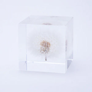 The Sola cube’s dandelion is our product with fresh flush being preserved inside acrylic cube. Its fluffy round ball is a high performing parachute. When rains, the parachute ball will close like an umbrella, and when it dries, it will reopen and fly up to the sky.