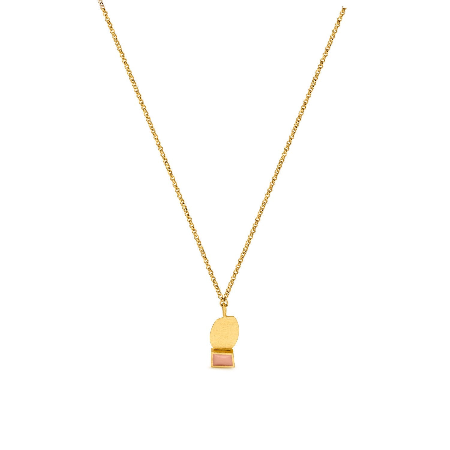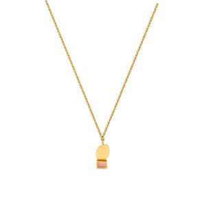 Necklace with a small pendant with two imperfect geometric shapes that combine randomly. Piece made of 24 K gold-plated matte metal and mauve enamel. Chain with lobster closing and extension chain.