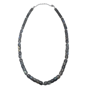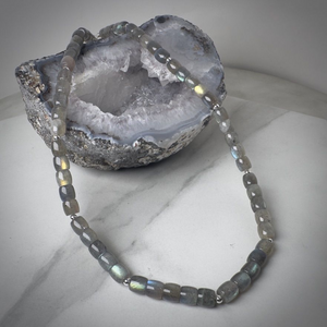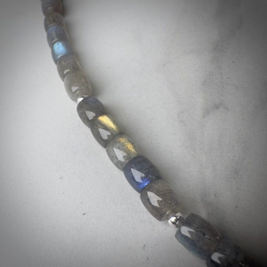 This elegant and minimalist necklace features a Labradorite with a striking blue-green-yellow sheen, a mineralogical phenomena also known as Labradorescence.