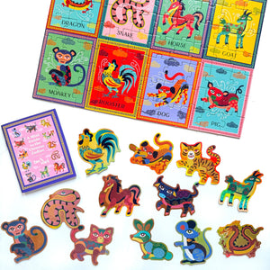 Explore the Chinese Zodiac (and Vietnamese Zodiac variations) through this engaging 100-piece puzzle! Featuring vibrant illustrations of all 12 zodiac animals, it’s designed to help kids and families learn about zodiac meanings, personality traits, and Lunar New Year traditions. With durable, smooth-finish pieces and a BONUS mini guidebook to the Chinese Zodiac PLUS a shimmery sticker set of the Chinese and Vietnamese Zodiac animals, this puzzle set makes cultural learning fun and interactive—perfect for curious minds and meaningful family time! Ages 5+