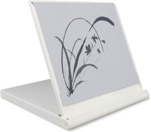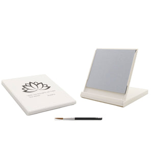 The Mini Buddha Board is an elegantly packaged, 5-inch square portable Buddha Board that folds into its own small easel stand. It has a little trough for water if desired, and comes with a small paint brush. Enjoy!