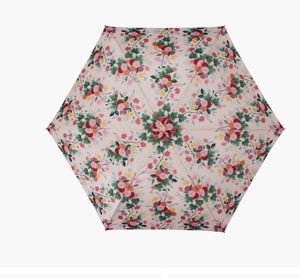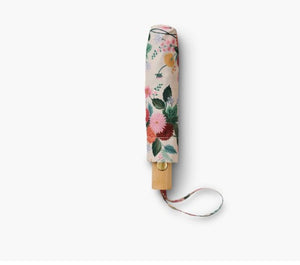 Brighten up rainy days with the Dahlia Umbrella, adorned with vibrant Dahlia blooms in full color. Its wooden handle and embossed logo button add a touch of charm, while the auto open/close feature makes it easy to use on the go. Compact when folded, it fits neatly into its matching patterned sleeve, making it a stylish and practical companion for any weather.