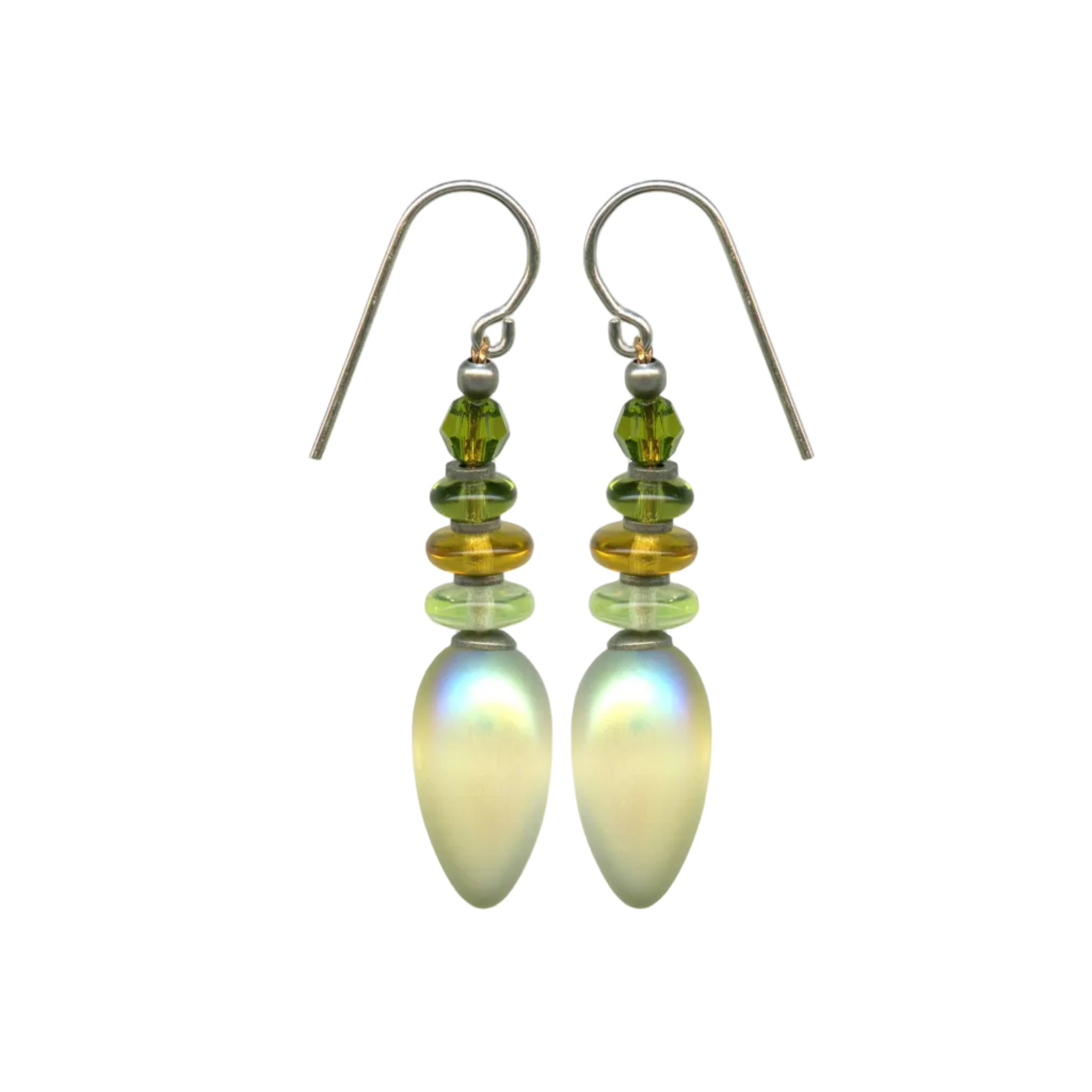 Delightful drop earrings in shades of yellow and green earrings. The frosted yellow drops with an iridescent finish are accented with Czechoslovakian glass and olivine green Austrian crystal top beads.