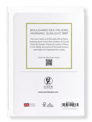 Text on the reverse side: The view here is of the daily life of Paris, looking down from the window of Grand Hotel de Russie. Pissarro’s works of Paris in the 1890s are some of the best known examples of Impressionist works.